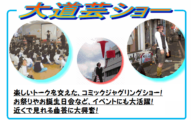 基本的にこの3つをミックスして30分間のコミカルジャグリングショーを行います。