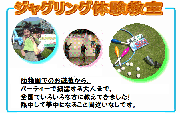 【ボールジャグリング(お手玉)】【バルーン体験】【ディアボロ(中国ゴマ)】【皿回し】【シガーボックス】【デビルスティック】【ポイ】などの教室が行えます。